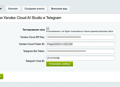 После заполнения токена и Chat ID нажмите кнопку "Установить вебхук" в настройках модуля.
