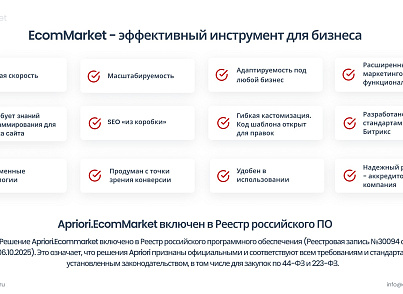 Решение Apriori.Ecommarket включено в Реестр российского программного обеспечения (Реестровая запись №30094 от 06.10.2025). Это означает, что решения Apriori признаны официальными и соответствуют всем требованиям и стандартам, установленным законодательством, в том числе для закупок по 44-ФЗ и 223-ФЗ.