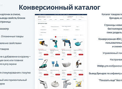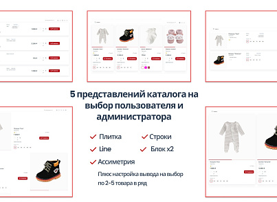 - 3 варианта карточек в списке товаров. 3 варианта вывода свойств. Настраиваемый показ бренда и коллекции.