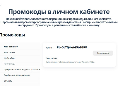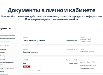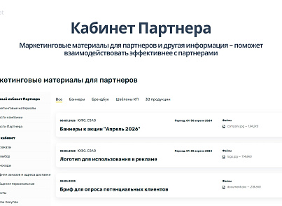Используйте отдельный личный кабинет для партнеров, дилеров. Размещайте закрытую для других пользователей информацию, маркетинговые материалы. Также доступен весь функционал кабинета Клиента.