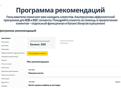 - Программа рекомендаций — для расширения личных продаж. Позвольте пользователям делиться с вами потенциальными клиентами. Особенно актуально для B2B-компаний. Начисляйте вознаграждение за заказы рекомендованных клиентов.