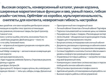- Легкое управление свойствами — показ в списке товаров, показ на детальной, показ справа от слайдера товара, стандартное управление из админпанели и настройки компонентов.