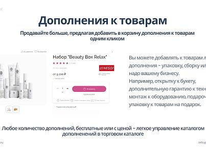 Превращайте карточку товара в конверсионную посадочную страницу. «Аксессуары», «Похожие товары», «С этим товаром покупают» плюс более 10 вариантов блоков связанной информации в карточке товара. Покажите всю информацию важную для клиента и SEO — вопросы и ответы, связанные статьи, преимущества, проекты или образы в lookbook.