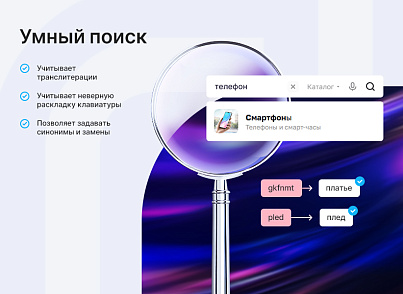 Увеличивайте средний чек и удовлетворенность пользователей благодаря Аспро: Умный поиск. Это модуль с расширенными возможностями поиска товаров, услуг и информации на сайте. Учитывает неправильную раскладку клавиатуры и транслитерацию. Позволяет задавать синонимы и замены для ключевых слов.