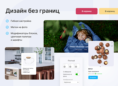 Упростите подбор товаров с помощью интерактивного дизайна. Впервые в наших решениях вы можете установить метки на фото с ссылками на продукцию. Презентуйте комплекты товаров и создавайте уникальные образы. Клиенты увидят, как стильно смотрится комплект, и по меткам на фото узнают о товаре без перехода в карточку. Путь к покупке сократится до минимума, а средний чек вашего интернет-магазина увеличится!