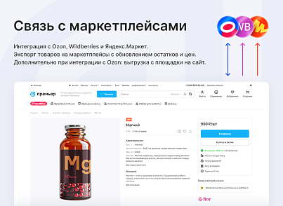 Увеличивайте количество каналов сбыта для продвижения компании. Готовое решение интегрируется с маркетплейсами Wildberries, Ozon и Яндекс.Маркет. Вы можете экспортировать товары с сайта на маркетплейс с возможностью обновления остатков и цен. Дополнительно при интеграции с Ozon доступна обратная выгрузка: с маркетплейса на сайт. Продвигайтесь на разных площадках, чтобы укреплять позиции в онлайне!
