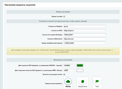 - Заполните ссылки на мессенджеры и телефон, которые должны отображаться в виджете (Telegram, MAX, WhatsApp, ВКонтакте, телефон). Пустые поля скрывают соответствующую иконку.