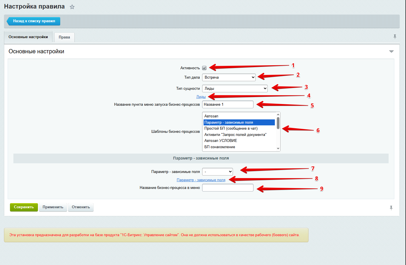 - Указывать, какие бизнес-процессы показывать в карточках CRM в зависимости от значения поля