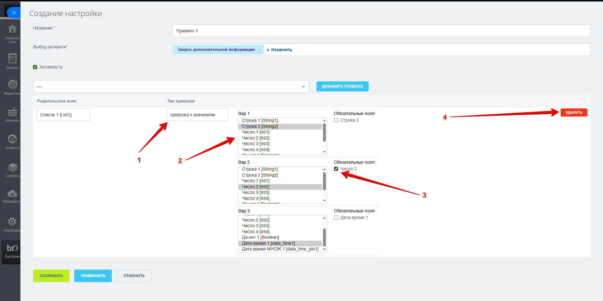 4. Выбор родительского поля. На текущий момент в качестве родительских можно выбирать поля с типом "Список" и "Да/нет"