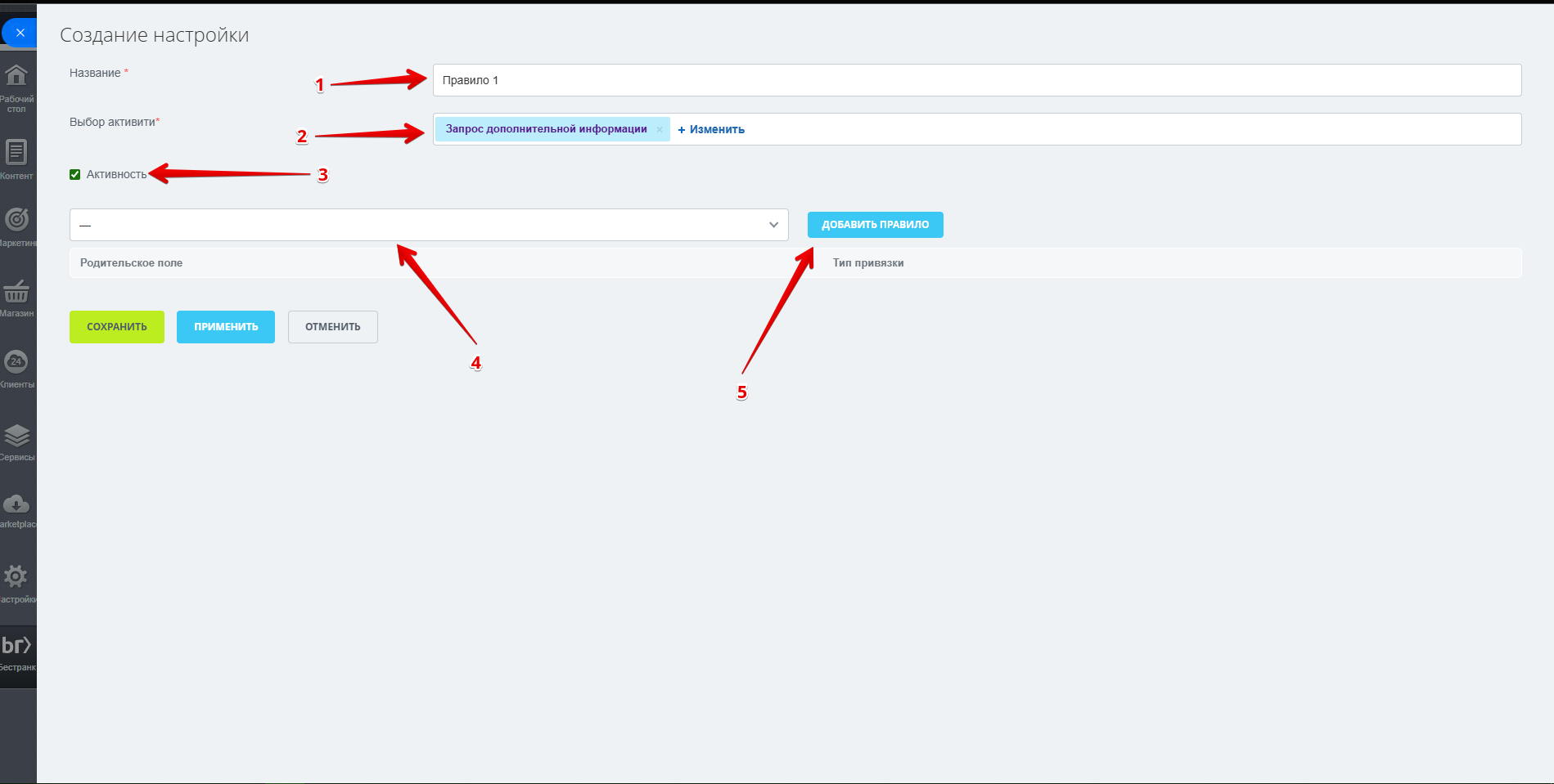 Чтобы создать новое правило, нажмите кнопку "Добавить"