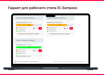 Модуль “Bquadro: Проверка скорости загрузки по Google PageSpeed” выводит на рабочий стол 1С-Битрикс гаджет с показателями выбранных веб-страниц, просканированных с помощью инструмента PageSpeed Insights.