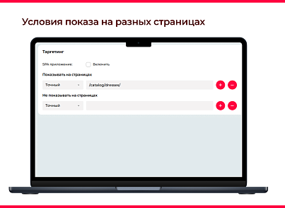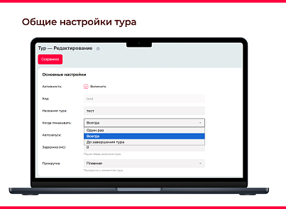 Условия срабатывания. Установите, для каких url будет показываться ваша интерактивная инструкция: можно указать точные адреса, либо начало адреса. Здесь же можно, наоборот, перечислить, на каких страницах тур отображать не нужно.