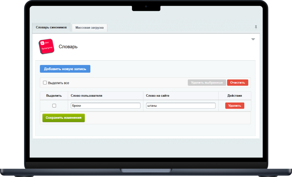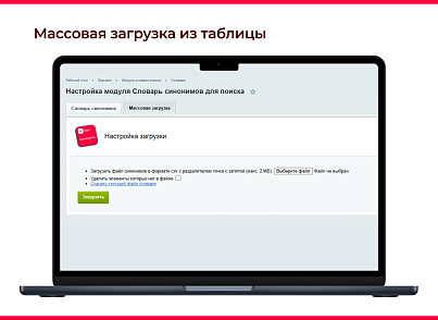 Массовое добавление слов. Это осуществляется на вкладке "Массовая загрузка". Для массовой загрузки списка синонимов прикрепите файл в формате csv с разделителем точка с запятой. Здесь же можно скачать текущий файл словаря.