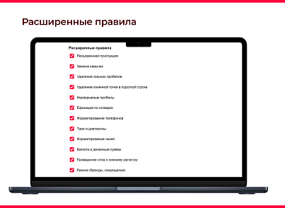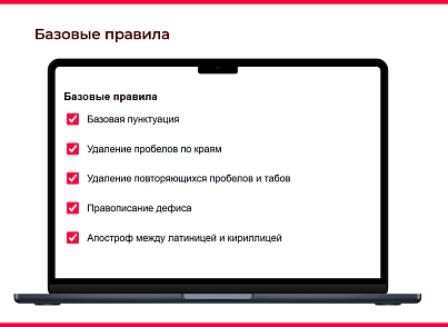 приведение тире и кавычек к правильному виду, форматирование телефонов, замена “е” на “ё” по словарю, удаление конечной точки в короткой строке, корректное написание диапазонов температуры и др.