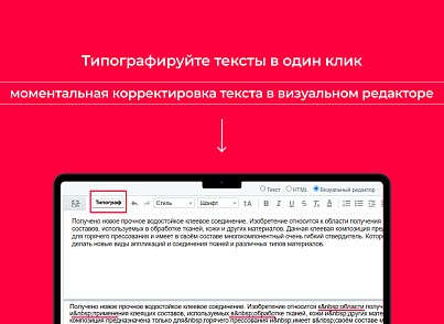 Модуль "Bquadro: Типограф" — это инструмент для визуального редактора, который в один клик делает тексты аккуратными и корректными с точки зрения типографики.