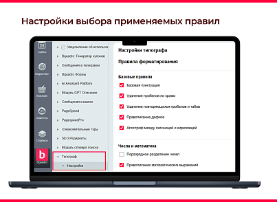Перейдите в «Bquadro → Типограф → Настройки» и включите нужные правила форматирования (базовые, математические и расширенные).