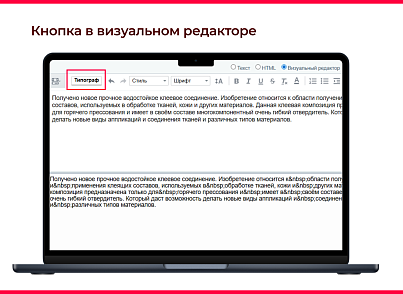 Для пользователя это выглядит как кнопка в визуальном редакторе. После ввода текста просто нажмите на кнопку и текст отформатируется согласно выбранным в настройках модуля правилам.