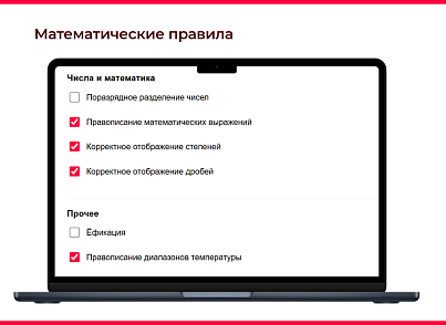 корректное написание чисел с разрядами, оформление математических выражений, дробей и степеней.