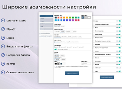 - гибкие настройки блоков сайта, основных параметров