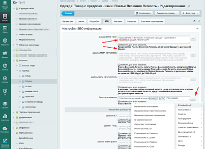 - подставлять поля (включая собственные) в текст страницы, метатеги