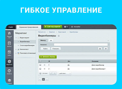 Управление и настройка видеобаннеров осуществляется в Маркетинг->Видео-виджет->Видеобаннеры