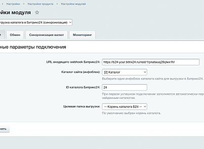 - На вкладке «Основное» укажите входящий webhook Битрикс24.