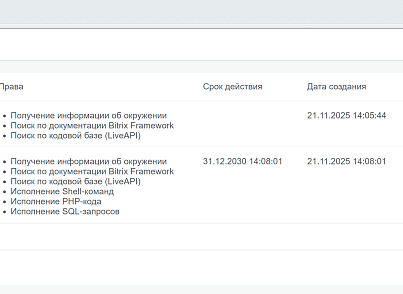 Токены с правами на исполнение PHP/Shell/SQL кода рекомендуется использовать только на тестовых площадках! Помните, что AI-агенты ошибаются и могут удалить или испортить ваши данные.