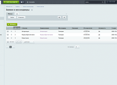 2. После того, как модуль установлен, перейдите на страницу настройки модуля Администрирование -> Сервисы -> Заявки в мессенджеры. В разделе Список агентов нажмите на кнопку Добавить