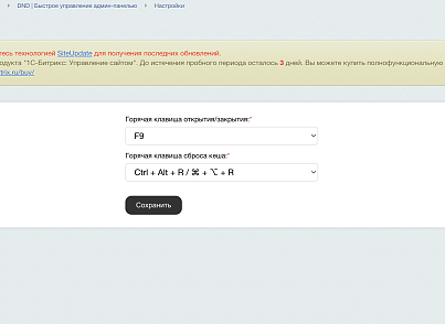Возможности модуляСкрытие и отображение админ-панели по горячей клавише