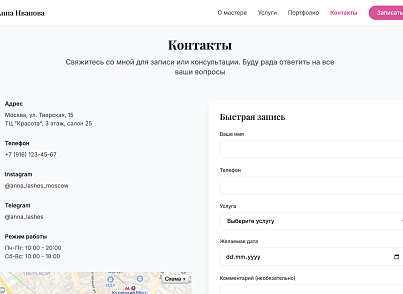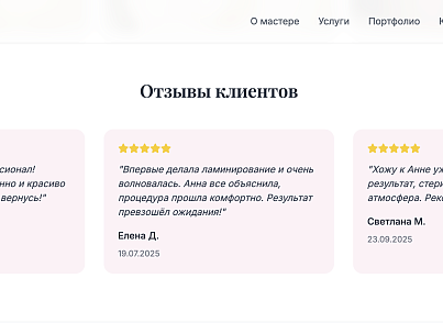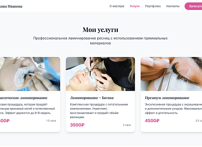 Решение представляет собой современный лендинг для мастера по ламинированию ресниц, выполненный как одностраничный сайт с адаптивным дизайном, интерактивными элементами и удобной системой взаимодействия с посетителями.