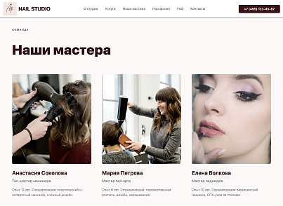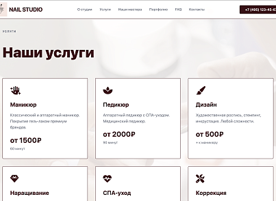 - Услуги (Services) — карточки услуг с описанием, ценой, длительностью и категориями (маникюр, педикюр, дизайн)