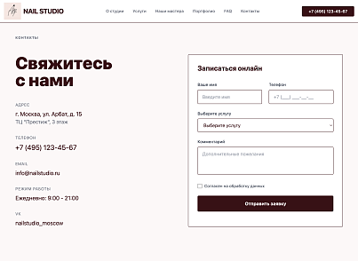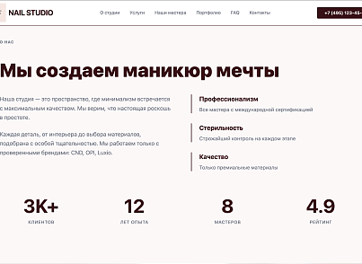 Современный одностраничный веб-сайт для салона ногтевого сервиса, разработанный на платформе 1C-Bitrix. Решение представляет собой полнофункциональный landing page с элегантным дизайном, системой управления контентом и интеграцией форм обратной связи с Ajax-отправкой.