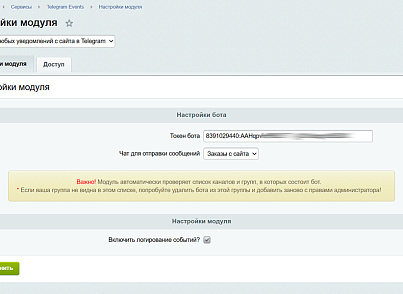 Модуль предназначен для отправки сообщений в Telegram при срабатывании почтовых событий на вашем сайте. Гибкая настройка шаблонов уведомлений которые будут отправляться в указанный Telegram-чат, а так же поддержка всех редакции Битрикс от «Старт» до «Бизнес», и всех популярных готовых решений!