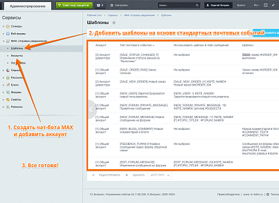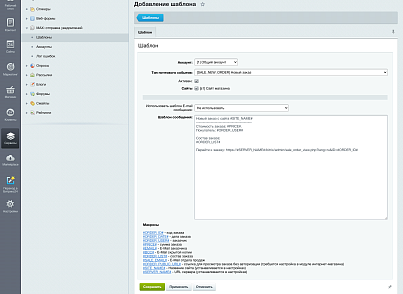 - Добавьте необходимые уведомления используя стандартные почтовые события 1С-Битрикс. Можно использовать стандартные шаблоны почтовых событий или создать свои.
