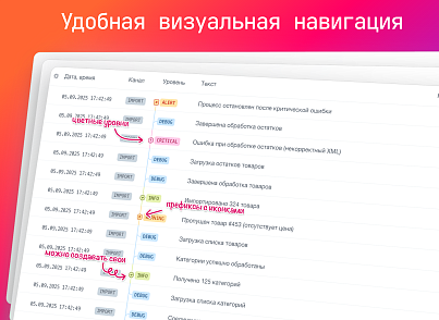 Вся мощь Monolog 3 в Битрикс: фильтры, ротация и удобный интерфейс — в один клик!   ✅ Цветовые префиксы: ошибка красная, успех зелёный — хаоса больше нет   ✅ Фильтры и поиск: найдёшь баг быстрее, чем его заметит клиент   ✅ Автоматическая ротация: логи не пухнут до гигабайтов   ✅ Работает «из коробки» и не требует настройкиQuick Startuse \Bitrix\Main\Loader;use \IHead\Logs\FileLogger;if (Loader::includeModule('ihead.logs')) {    $logger = new FileLogger('user');    $logger->info('Order created', ['id' => $orderId]);    $logger->error('Payment failed', ['order' => $orderId, 'error' => $e->getMessage()]);}        И наслаждаемся удобным логом:FAQ❓Чем этот модуль лучше встроенного Журнала событий?Встроенный журнал неудобен: всё свалено в одну кучу, поиск ограниченный. Здесь — цветовые префиксы, фильтры по уровню/префиксу/тексту, отдельные логи для своих задач и нормальный интерфейс.❓Нужно ли что-то настраивать или править ядро?Нет. Ставите модуль через маркетплейс — и он сразу работает. Никаких правок ядра.❓Где хранятся логи и как работает ротация?По умолчанию — в /local/.logs. Ротация по размеру и сроку: старые файлы архивируются или удаляются автоматически, без ручной чистки.❓Можно ли подключить внешние системы (ELK, Graylog, Telegram)?Да. Используется Monolog 3, значит доступны любые стандартные хендлеры: файлы, HTTP, Slack, Telegram, Graylog и другие.❓Как это влияет на производительность?Минимально. Файловый режим обрабатывает десятки тысяч записей в минуту на обычном SSD. Система работает отдельно от ядра, блокировок не создаёт.❓С какими версиями PHP и редакциями Битрикс совместимо?Поддержка PHP 8.2–8.3. Редакции: от «Первый сайт» до «Бизнес», коробочные версии Битрикс24❓Что будет, если удалить модуль?Логи остаются. Никаких «хвостов» или сломанных зависимостей.❓Я уже использую Monolog в проекте — модуль мне нужен?Да! Модуль понимает любые логи Monolog: формат и каналы настраиваются, поэтому вы можете писать логи своим кодом или сторонними сервисами, а читать и фильтровать их — через удобный интерфейс прямо в Битрикс. Без доработок ядра, без плясок с grep и tail.❓Куда обращаться за поддержкой?Мы отвечаем быстро и по-человечески. Пишите на почту info@ihead.ru или напрямую в Telegram — @klikhachev.Что дальше?  ✴️ Настройка - fine-tuning модуля  ✴️ Список логов - название и описание логов, ротация  ✴️ Просмотр логов - фильтры, поиск, визуализация  ✴️ Префиксы - улучшаем UX, снижаем когнитивную нагрузку  ✴️ Хелпер - пишем логи в пару строк кода