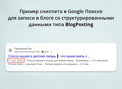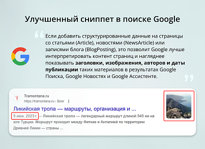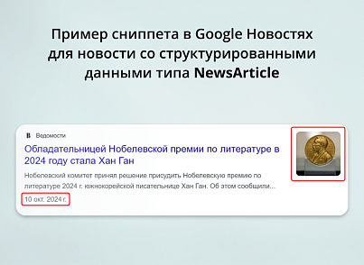 «Если добавить структурированные данные на страницы со статьями (Article), новостями (NewsArticle) или записями блога (BlogPosting), это позволит Google лучше интерпретировать контент страниц и нагляднее показывать заголовки, изображения и даты публикации таких материалов в результатах Google Поиска и на прочих ресурсах (например, в Google Новостях и Google Ассистенте). Хотя функции Google Новостей, например карусель Главные новости, не диктуют каких-либо особых требований к разметке, мы рекомендуем добавлять структурированные данные типа Article. С их помощью вы сможете сообщать Google дополнительную информацию о контенте (например, то, что это новостная статья, кто ее автор или как она называется).»