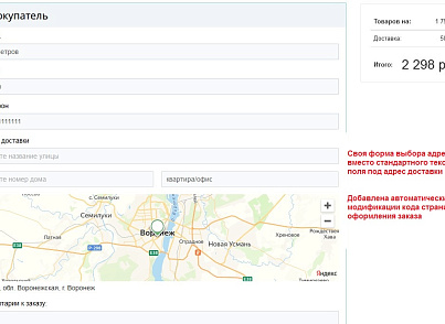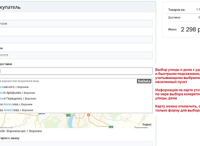 Модуль позволяет заменить стандартное поле ввода адреса в оформлении заказа на удобную форму с возможностью быстрого ввода адресов Российской Федерации используя сервис автоподсказок Dadata. Форма снабжена картой, на которой маркером будет показан выбранный адрес. Если среди полей оформления заказа имеется поле почтового индекса, оно будет заполняться автоматически по мере выбора желаемого адреса.