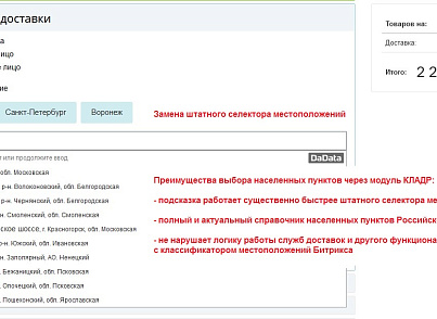 Также в модуле предусмотрена возможность замены стандартного селектора местоположений Битрикса на поисковую строку с выбором населенных пунктов через автоподсказки Dadata. При этом штатный селектор местоположений будет визуально скрыт, а по выбранному через Dadata населенному пункту будет автоматически подставлено соответствующее местоположение Битрикса, что необходимо для корректного расчета доставок, работы Ограничений и прочего функционала CMS.