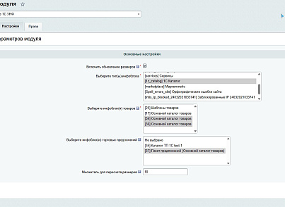 - Выбрать при необходимости инфоблоки торговых предложений, для которых необходимо заполнять габариты в параметрах торгового каталога.