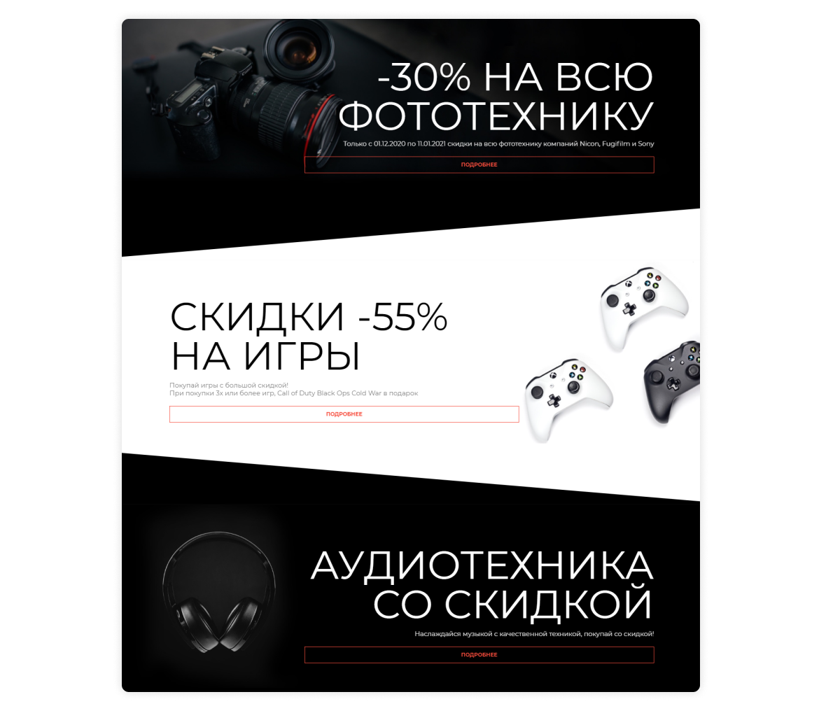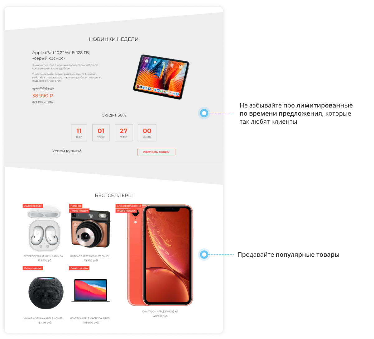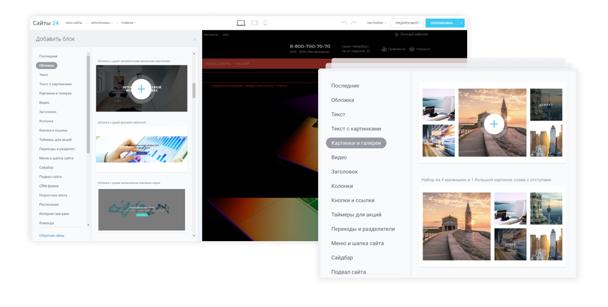 Выбирайте из более 350+ готовых оригинальных блоков и добавляйте их в свой магазин:
