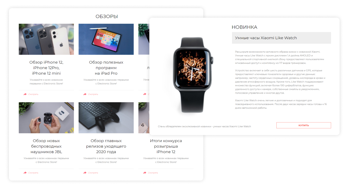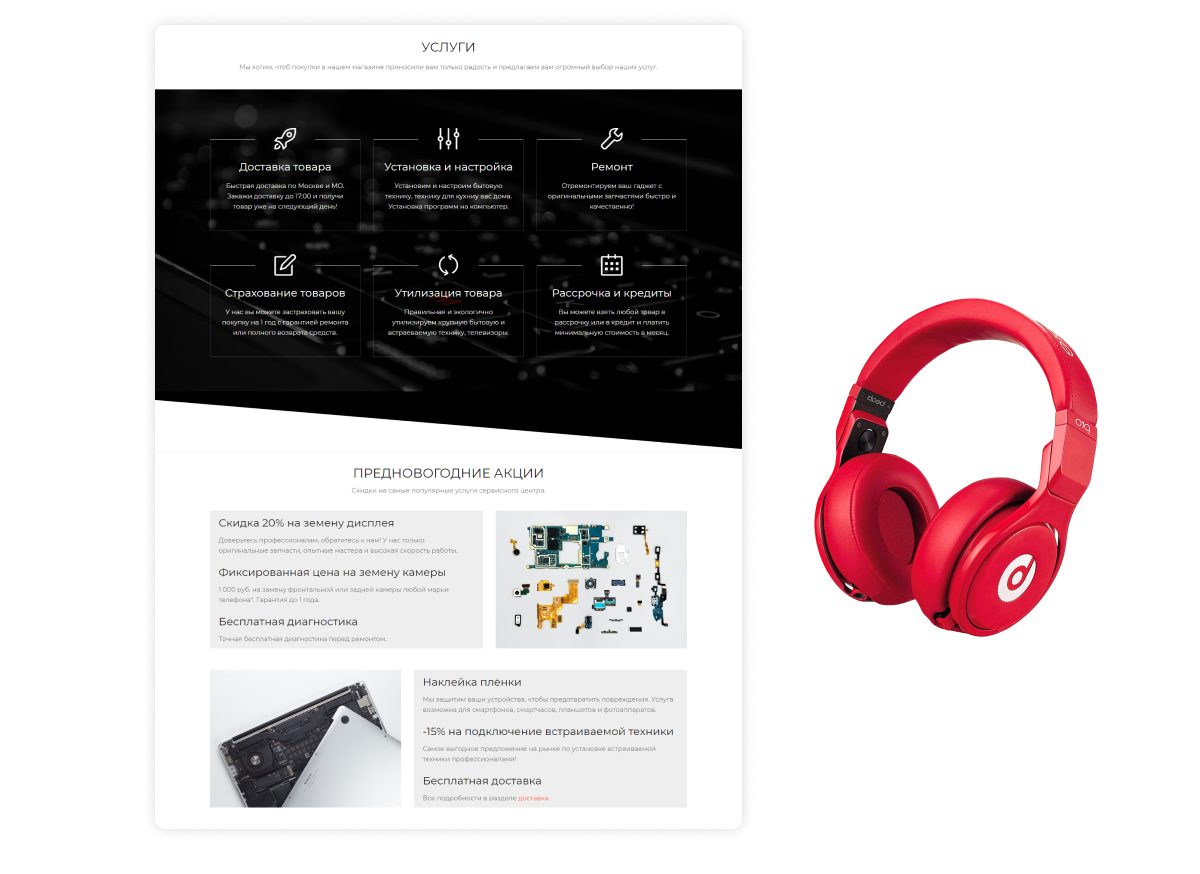 обложки, галереи, видео, таймеры для акций, меню, отзывы, этапы, контакты и многое другое.