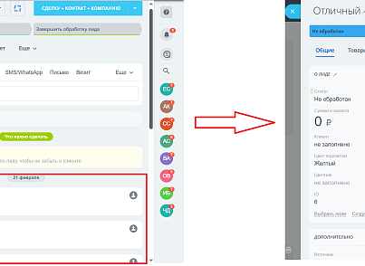 Рис. 1 - Пример отображения карточки лида до применения блокировки вывода комментариев и после нее