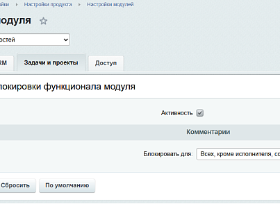 - «Активность» - активен ли функционал модуля для блокировки возможностей модуля CRM (по умолчанию - активен).