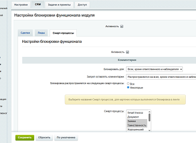 - «Смарт-процессы» - перечень смарт-процессов, для карточек которых осуществляется блокировка функционала. Возможно выбрать несколько из них. - «Задачи и Проекты»