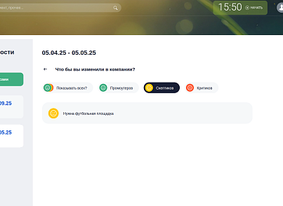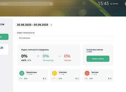 Модуль позволяет удобно организовать опросы eNPS (Employee Net Promoter Score, Индекс лояльности сотрудников), анализировать результаты конкретного опроса и как они меняются в динамике(когда проведено уже несколько опросов). Результаты можно смотреть как по компании, так и по отделам.