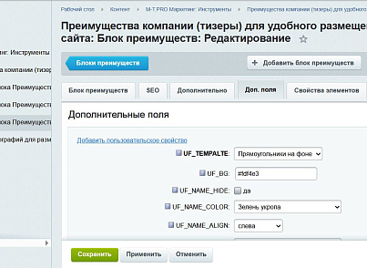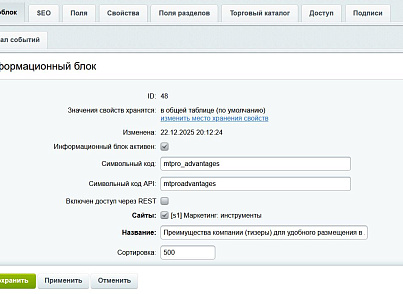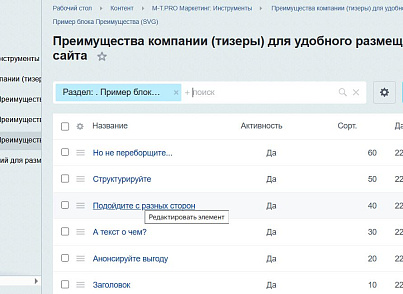 3. Идем в Контент/Инфоблоки/Типы инфоблоков/M-T.PRO Маркетинг: Инструменты/Преимущества компании (тизеры) для удобного размещения в любом месте сайта