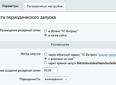 | | - Требования: PHP 8.0+, Bitrix v21.500.0+, Редакция Битрикс «Старт»+ - Процесс установки и настройки: После установки модуля в разделе «Настройки –> Инструменты –> Резервное копирование –> Регулярное резервное копирование», появится вкладка «Расширенные настройки»: