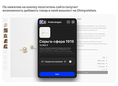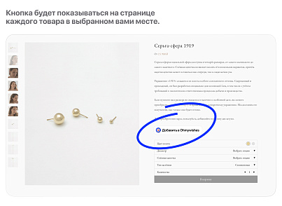 Кнопка будет показываться на странице каждого товара в выбранном вами месте. По нажатию на кнопку посетитель сайта получит возможность добавить открытый в браузере товар в качестве желания в свой вишлист на сайте Ohmywishes.