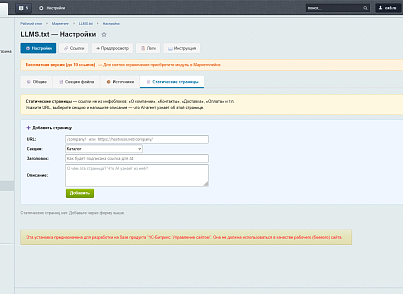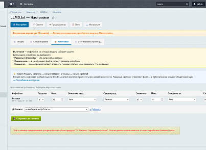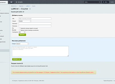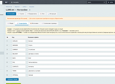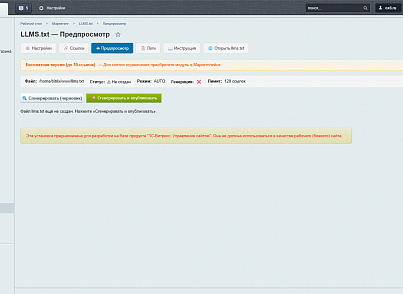 После установки откройте в админке: Настройки → LLMS.txt Manager (раздел настроек системы).