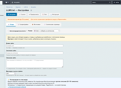 Модуль не заменяет sitemap.xml и robots.txt и не обещает “рост позиций”.